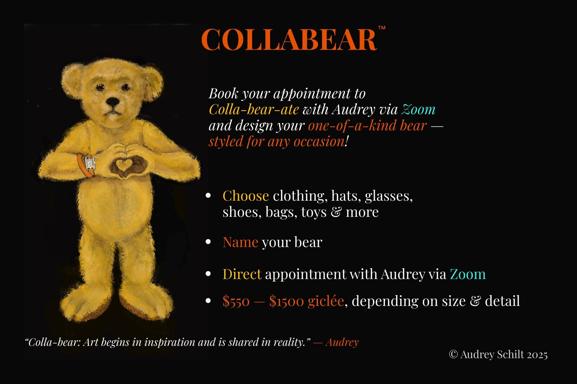 Exclusivity & use: This Collabear is one-of-a-kind for you. Audrey retains copyright and will never reproduce or license your Collabear. Personal use only (e.g., display at home or gift); commercial reproduction (e.g., merchandise, advertising) isn’t permitted.