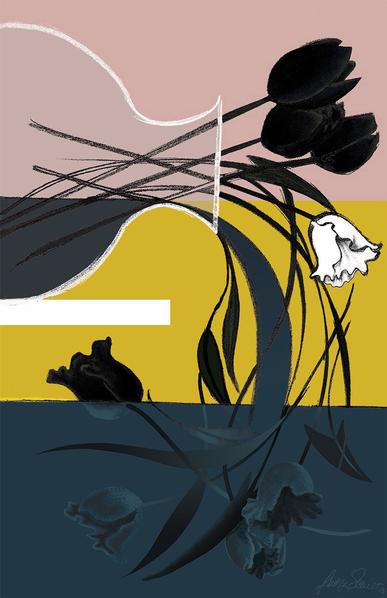 Image: 34 × 22 in (86.4 × 55.9 cm) + 1 in (2.54 cm) white border • Graphic illustration with abstract message “Fallen V.alues A.ffect S.ocial E.quilibrium.” The values of color are symbolically shown as black tulips (with only one white tulip)... The imbalance of values affecting any balance; color, society, etc. Yin–Yang (equal of black and white) brings balance to everything.