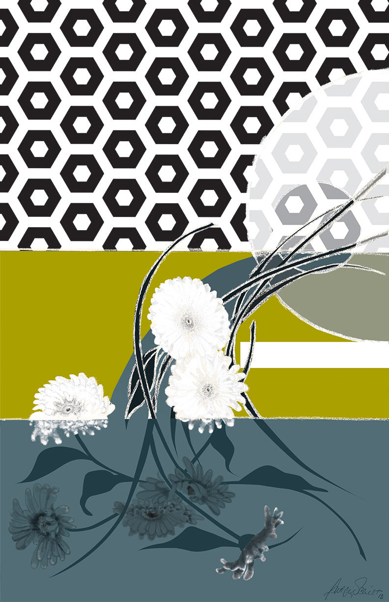 Image: 34 × 22 in (86.4 × 55.9 cm) + 1 in (2.54 cm) white border • Graphic illustration of an additional abstract message with this painting: “Fallen V.alues A.lter S.ocial E.xperience, too.” Fallen virtues, like values, result in an experience and how it's handled in an altered society.