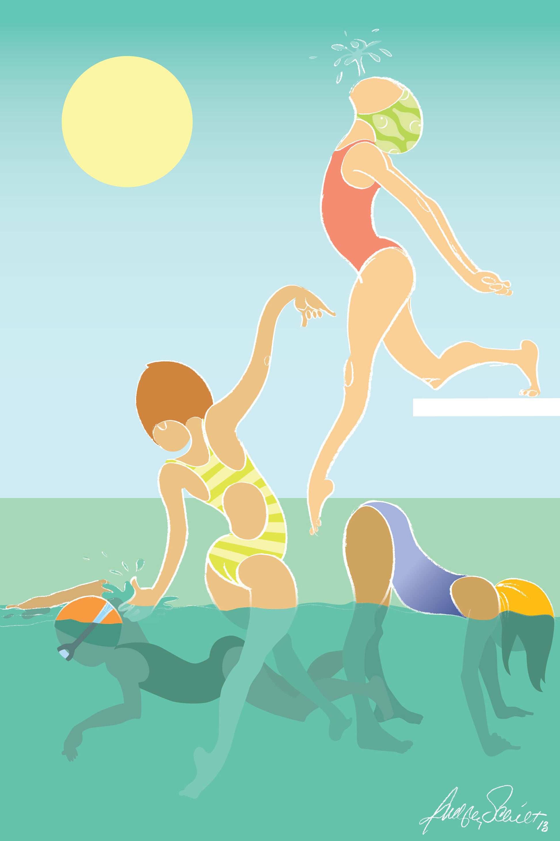 Image: 34 × 22 in (86.4 × 55.9 cm) + 1 in (2.54 cm) white border • Graphic illustration of little girl bathers diving, swimming, and having fun in a pool.