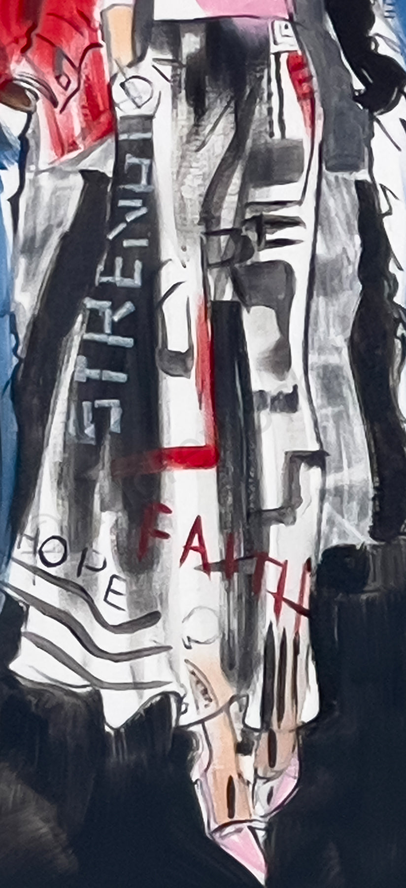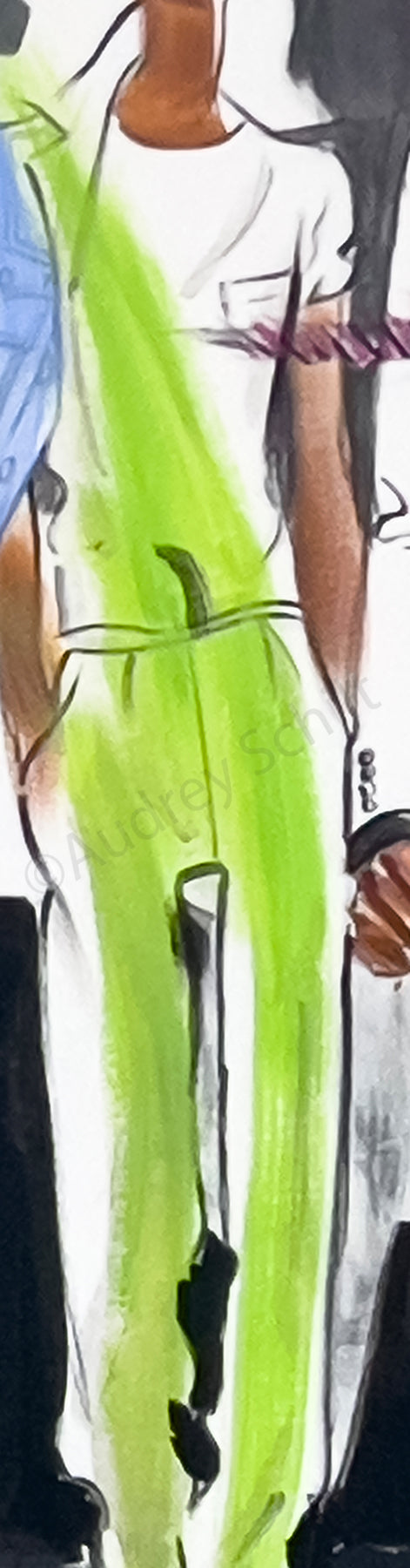 This painting depicts the people showing the trends of fashion, walking forward hand in hand to serve for the greater good in every situation. Diversity and inclusion need the joining of forces to solve the problems, in the easiest most beautiful way possible.