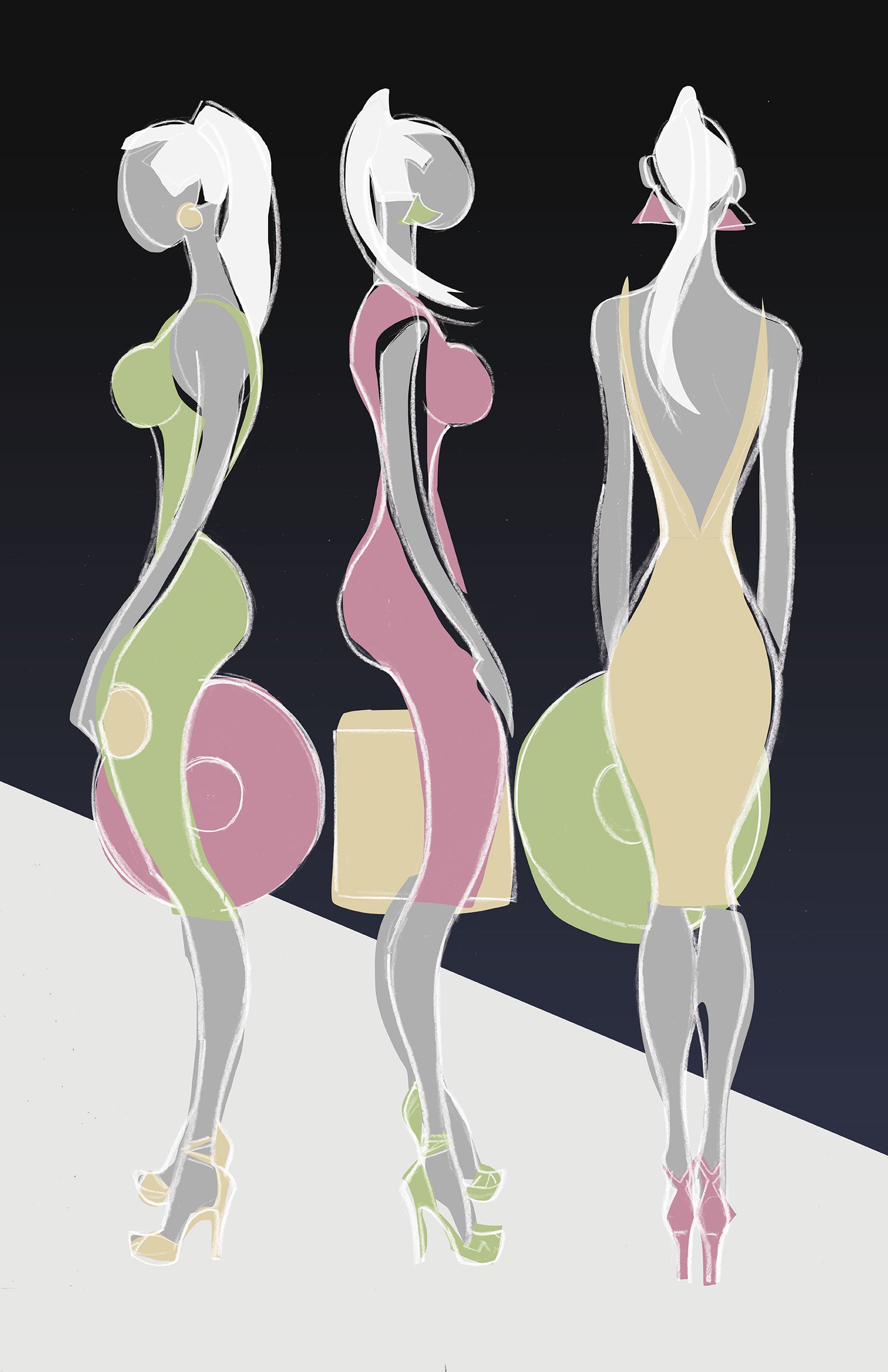 Image: 34 × 22 in (86.4 × 55.9 cm) + 1 in (2.54 cm) white border • Graphic illustration of three geometric style models in loosely applied shapes of color creating a mid-century modern feeling.