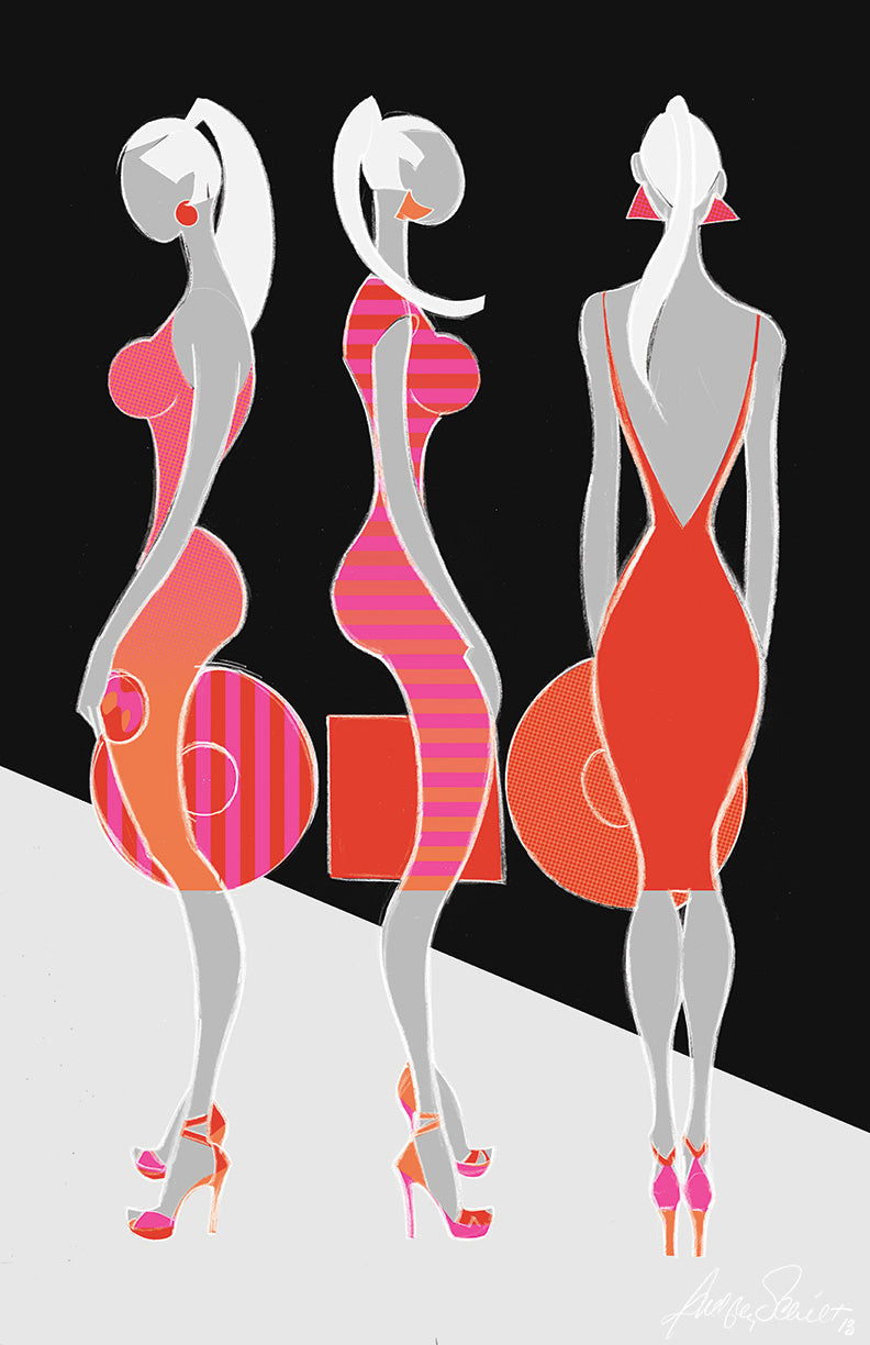 Image: 34 × 22 in (86.4 × 55.9 cm) + 1 in (2.54 cm) white border • Graphic illustration of three geometric style models in body-conscious dresses walking abstract runway (white hair).
